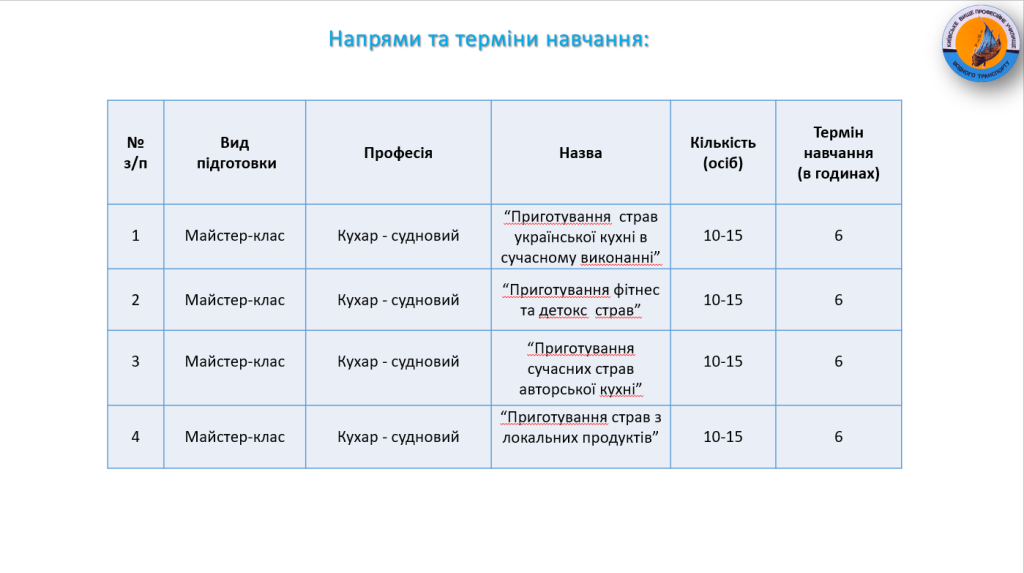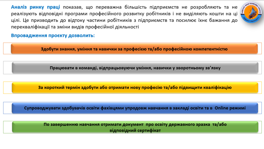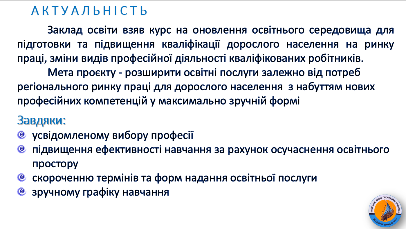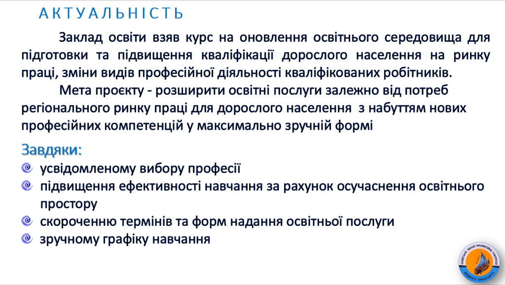 Заклад освіти взяв курс на оновлення освітнього середовища для підготовки та підвищення кваліфікації дорослого населення на ринку праці, зміни видів професійної діяльності кваліфікованих робітників.